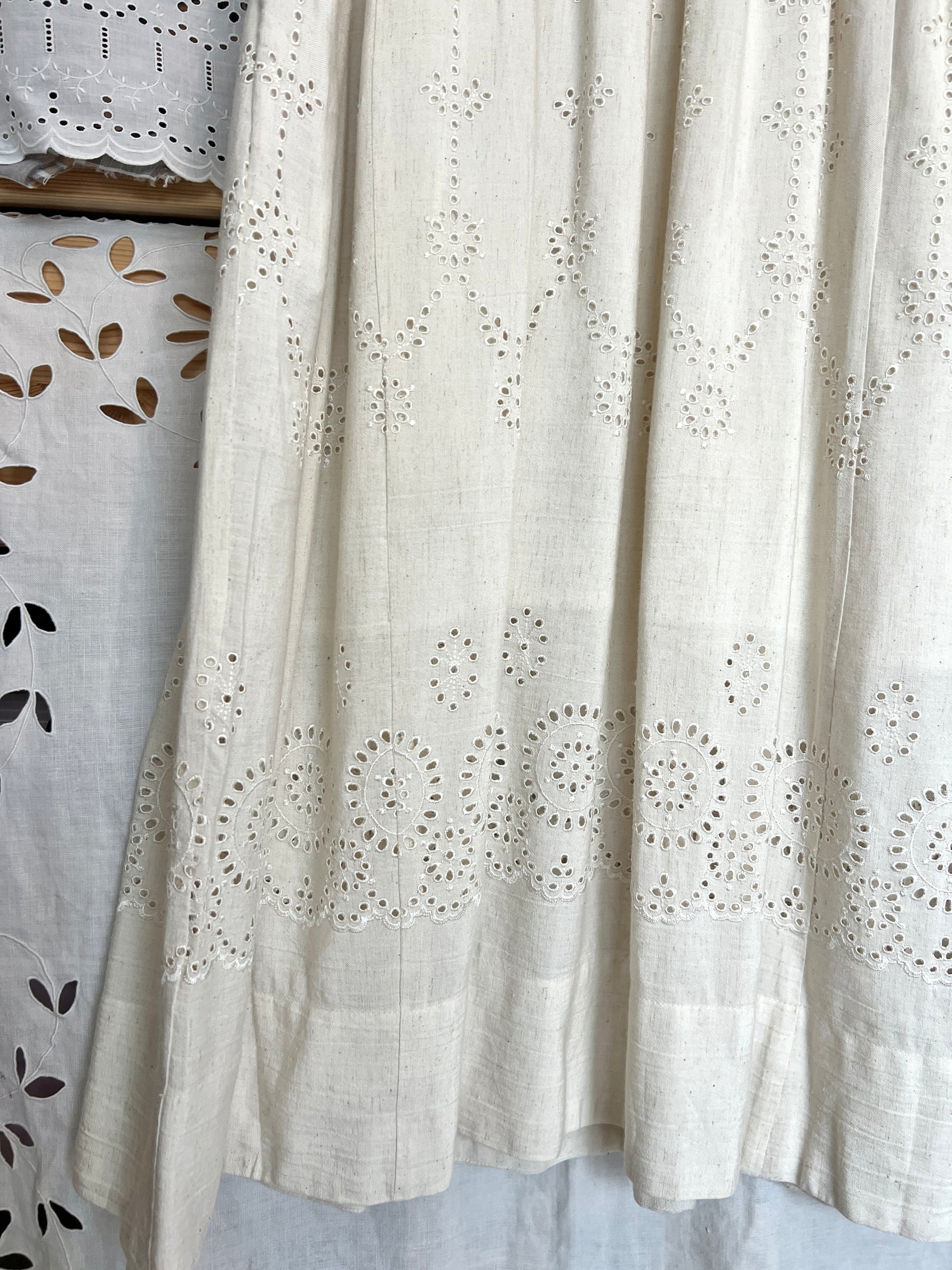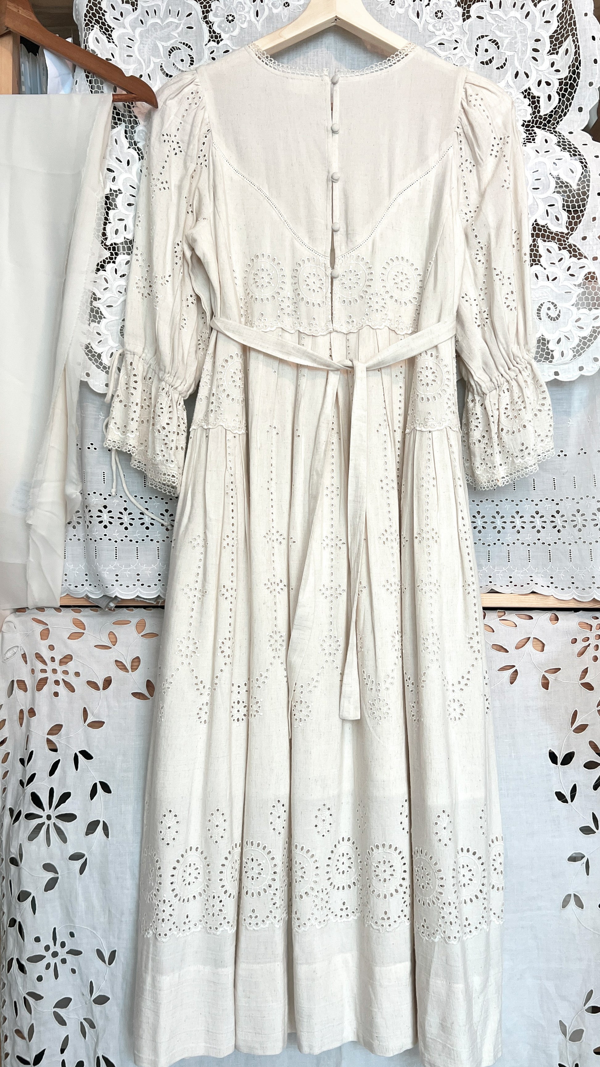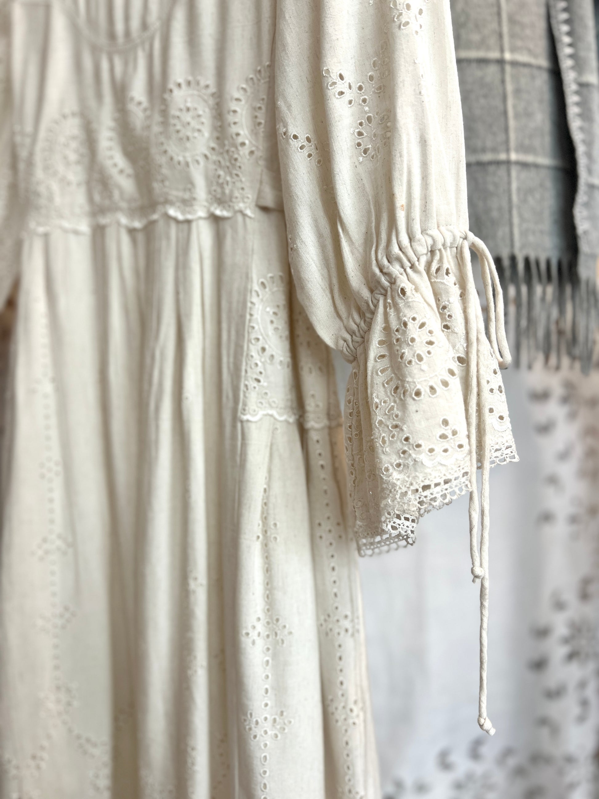 Inspired by vintage dressing, Miriam is a romantic, voluminous midi dress with all over eyelit embroidery. It features ruffled three quarter sleeves with structured puffed sleeve caps, lace trimmed edges and a waist belt to give you the fit that you prefer.